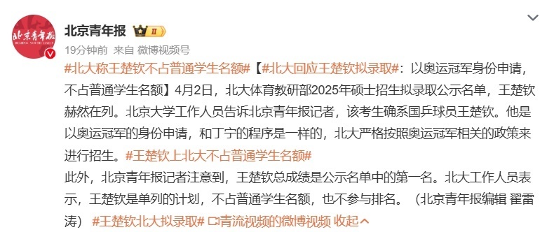 王楚钦晒北大入学照,此前北大曾回应其考研:以奥运冠军身份申请,不占普通学生名额